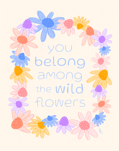 Celebrate your free spirit with this charming Wildflowers Print. Candied coneflowers frame the heartfelt phrase "you belong among the wild flowers," inviting a touch of whimsy and nature’s beauty into your space. Perfect for brightening any room, this playful design reminds you to embrace your unique path and bloom where you’re planted. Whether as a gift or a personal treat, it’s a delightful way to add color and inspiration to your everyday life.